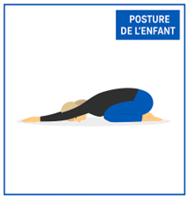 Pour la posture de l’enfant : agenouillez-vous, votre ventre repose sur vos cuisses, front au sol et fesses vers les talons. Vos bras peuvent soit être tendus vers l’avant, soit tendus vers l’arrière. Respirez profondément sur quelques cycles.